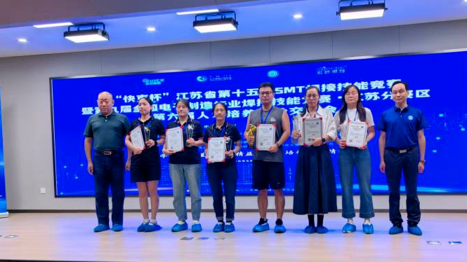 近日,由江苏省电子学会SMT专业委员会主办的“快克杯”江苏省第十五届SMT焊接技能竞赛暨第九届全国焊接能手选拔赛顺利落幕,中国船舶集团旗下连云港杰瑞电子有限公司(下称“杰瑞电子”)选派4人参赛并全部获奖。其中,葛露露荣获一等奖,李萍、曾庆露荣获二等奖,徐梦荣获三等奖,杰瑞电子喜获“优秀组织奖”。